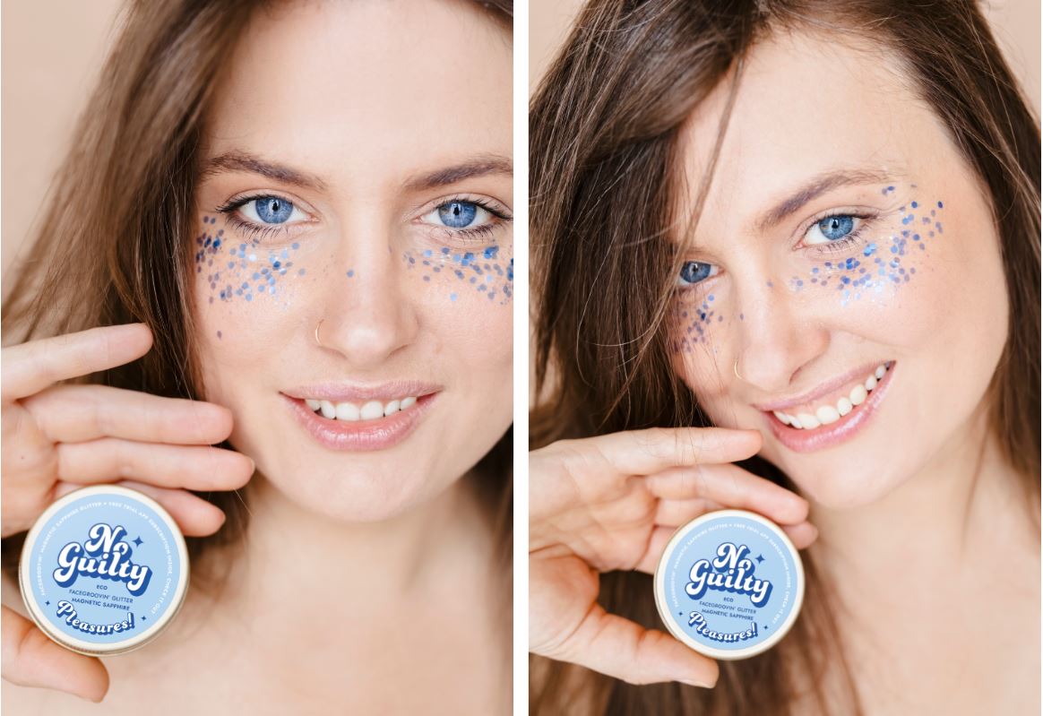 Bio glitter can be applied on with a special glitter glue, but it will also stick to your skin if you smear it with lip balm, sticky oil or even butter.
