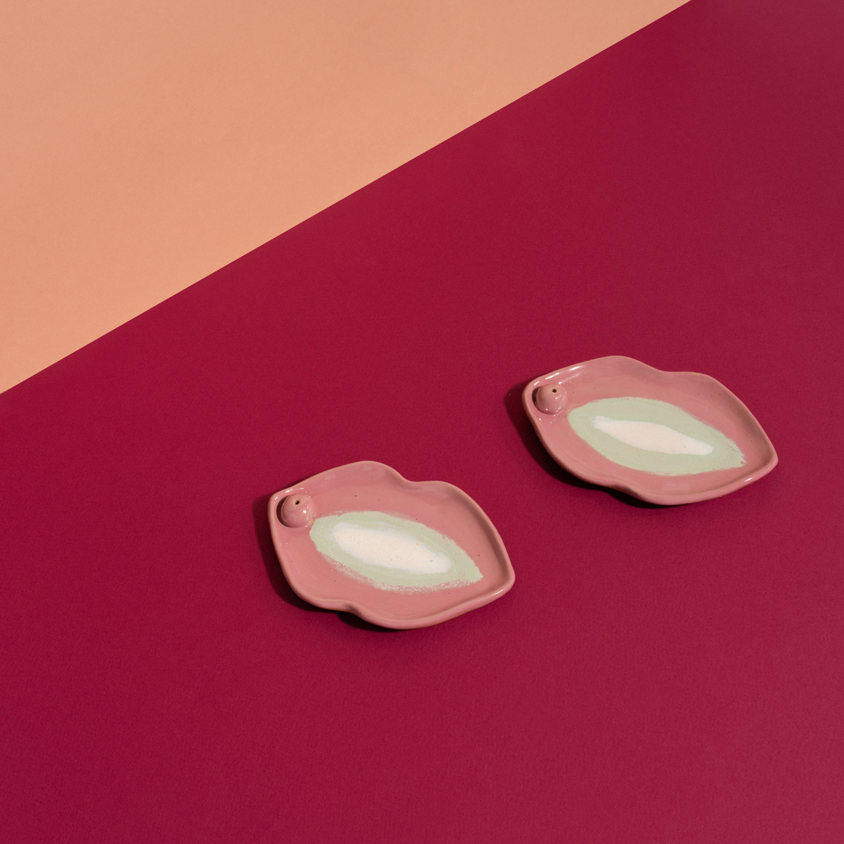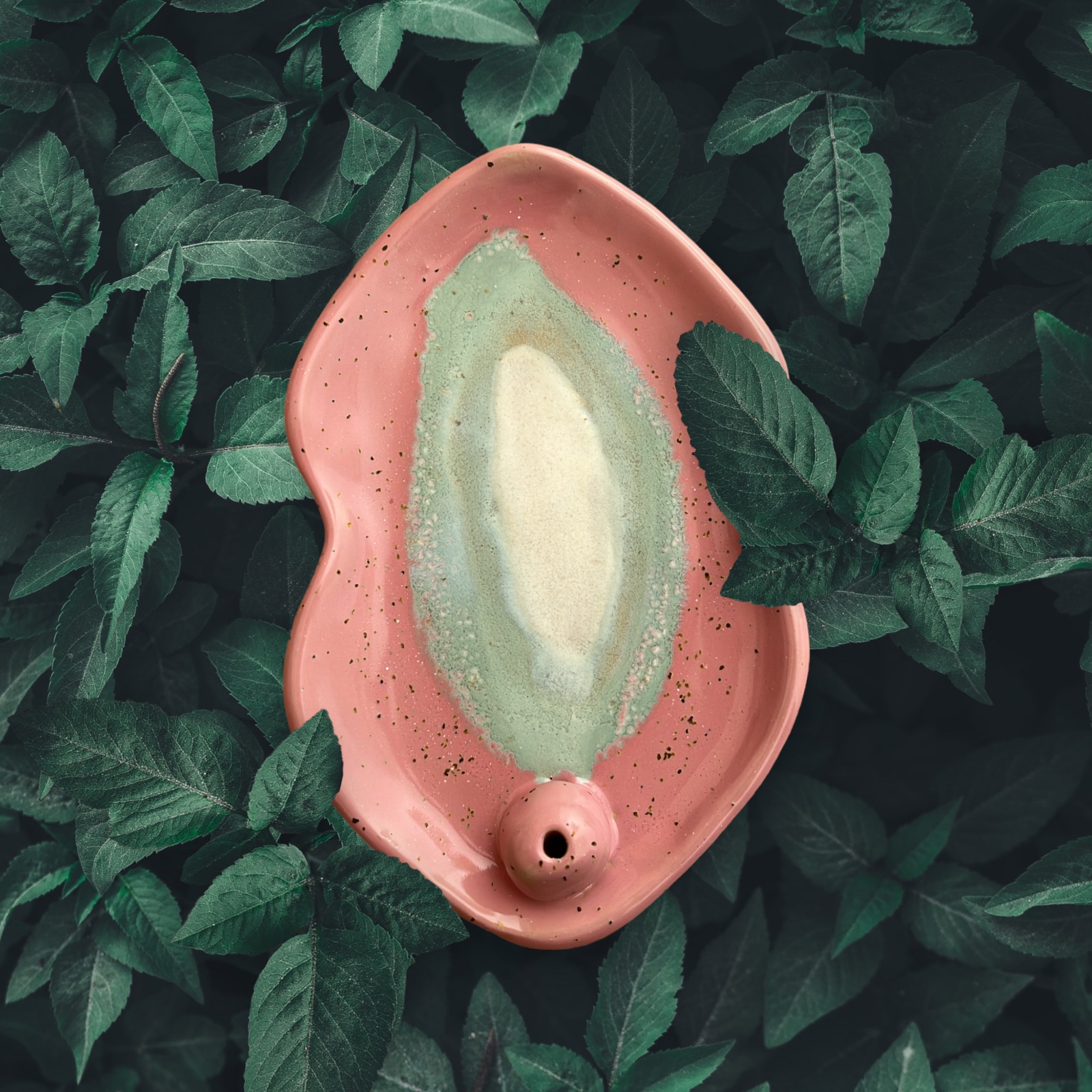 A ceramic tray in the shape of a female yoni or vulva in pink – mint colour and a shiny pearl centre. Use it as a burner to light your favourite incense, e.g. white sage or palo sticks. Where It All Begins is also great as a jewellery plate, soap dish or as a playful addition to your home space.
